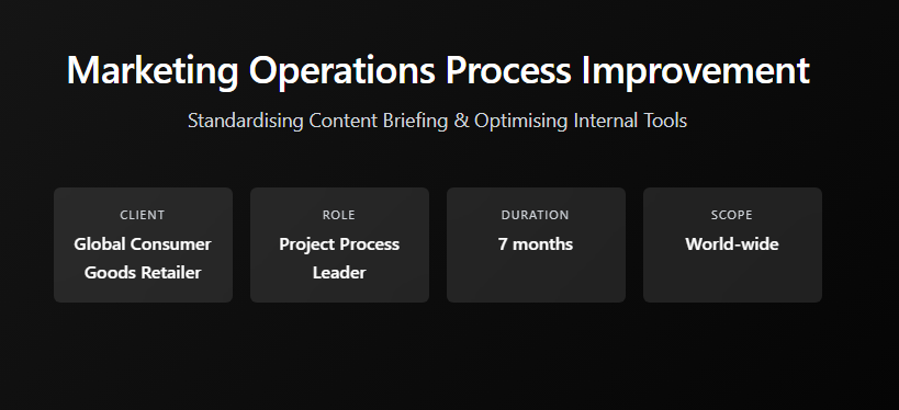 A marketing operations case study showing how redesigning briefing templates and internal workflows reduced rework and improved delivery predictability across global teams.