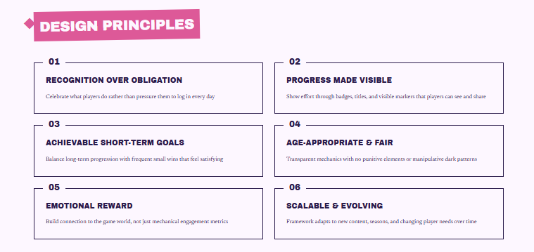 Progress Must Be Visible: Visual markers like stable upgrades or titles matter significantly for maintaining a sense of purpose.