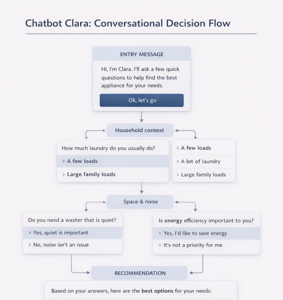 I designed and prototyped a conversational interface for a major retailer to replace dense technical filters with a guided dialogue. This helped customers navigate hundreds of complex appliances and choose the right product without needing technical expertise.
