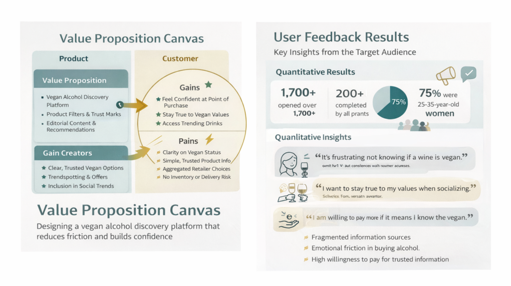 Interest in vegan alcohol was growing, but the market was fragmented and labelling was inconsistent. The client faced a significant business risk: they didn’t know if demand was sufficient to justify a scalable product and a complex supply chain.