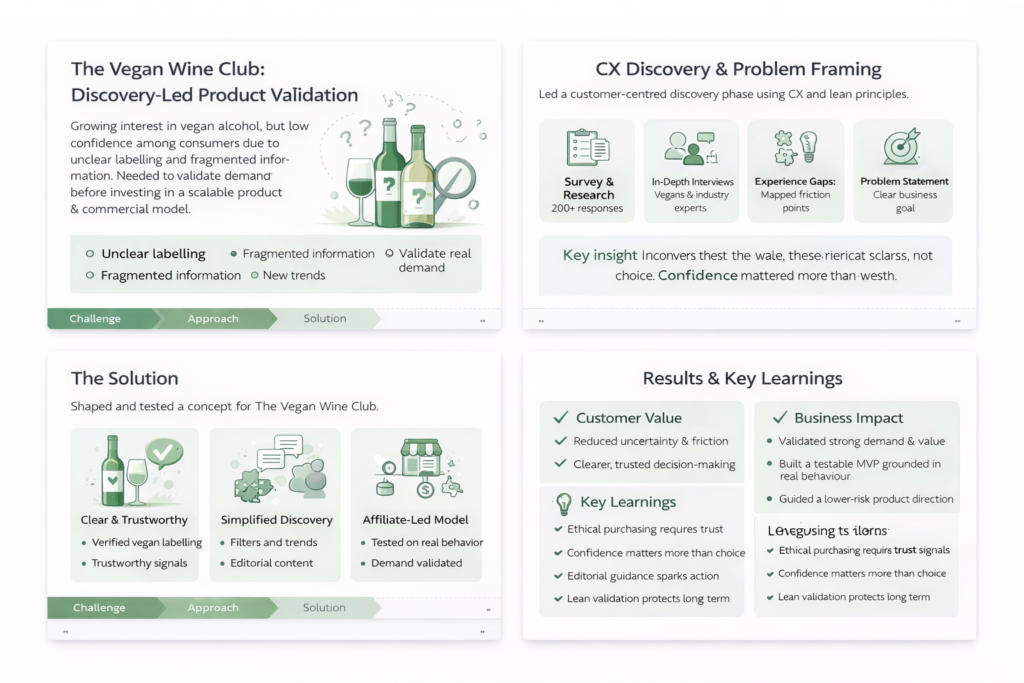 I led a consultancy project to assess the viability of a dedicated vegan alcohol proposition. Through a lean, customer-centred discovery phase, I identified that trust and reassurance mattered more than choice. I delivered a testable MVP concept and specific UI improvements that reduced commercial risk and provided a clear, evidence-based roadmap for investment.
