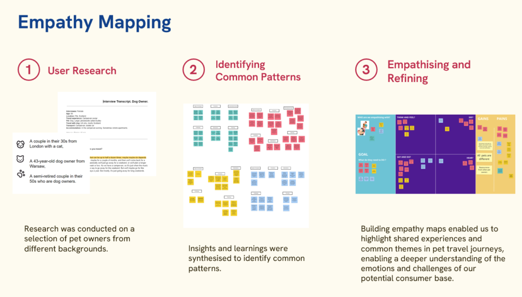 - User research and problem framing: I conducted qualitative interviews with pet owners who travel to identify key pain points around planning effort and uncertainty. I then created personas to represent different travel behaviours and confidence levels