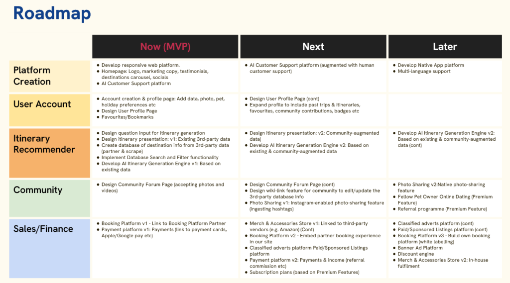 Roadmapping and handover: I created a product roadmap outlining the MVP and future enhancements while documenting all assumptions and next steps for the course assessment.